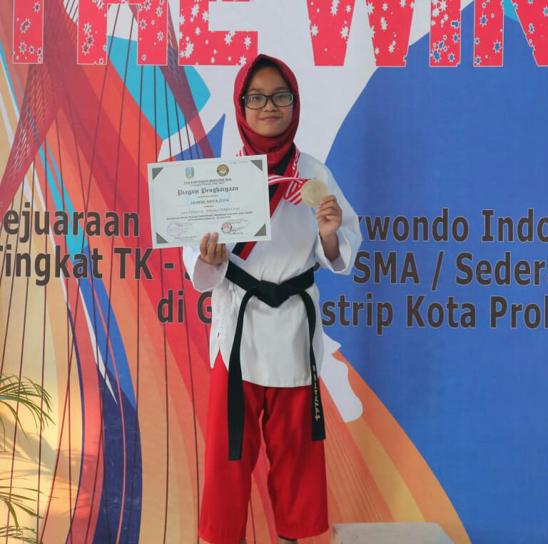 MUDIPAT.CO – Siswa SD Muhammadiyah 4 Pucang Surabaya (SD Mudipat) kembali meraih prestasi. Jasmine Abiya Zoya kelas 5 E meraih medali perak kategori Poomsae Individual Pemula Putri pada Kejuaraan Antar Pelajar Taekwondo Indonesia Provinsi Jawa Timur. Kejuaraan diselenggarakan oleh Pengurus Provinsi Taekwondo Jawa Timur dan Dinas Pendidikan Jawa Timur di Probolinggo pada Jumat-Ahad (27-29/07/2018).