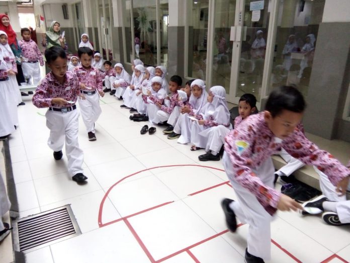 MUDIPAT.CO – Tampak wajah riang dan gembira siswa-siswi kelas 1 & 2 SD Muhammadiyah 4 Pucang-Surabaya. Kali ini giliran bagi mereka untuk mengikuti lomba lari kelereng. Lomba kali ini berbeda dan unik dari biasanya, Kamis (15/8/2018).
