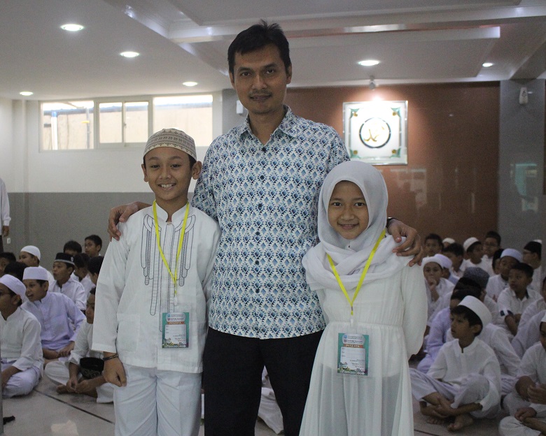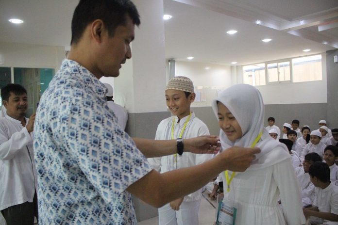 Ust. Ain menyematkan tanda peserta RIAS kelas 5. (anang/mudipat.co)