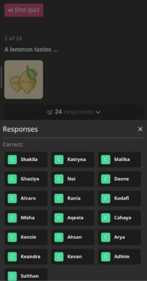 Ustadzah kemudian akan men-scan jawaban mereka melalui aplikasi Quizziz di handphone. Kertas akan otomatis terbaca sesuai nama pemilik mereka dan jawaban akan terekam sekaligus terkoreksi saat itu juga. Sehingga, hasil jawaban para siswa akan dapat langsung terlihat. Uniknya lagi, setiap siswa mendapatkan kertas dengan barcode yang berbeda sehingga mereka tidak bisa mengintip jawaban teman.