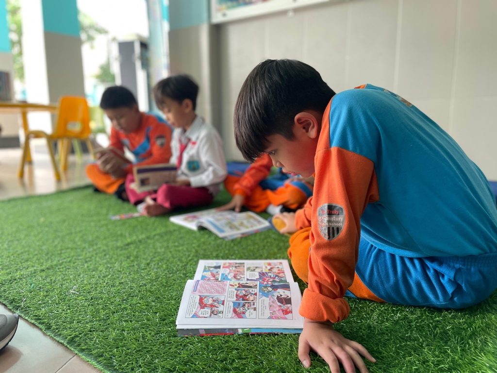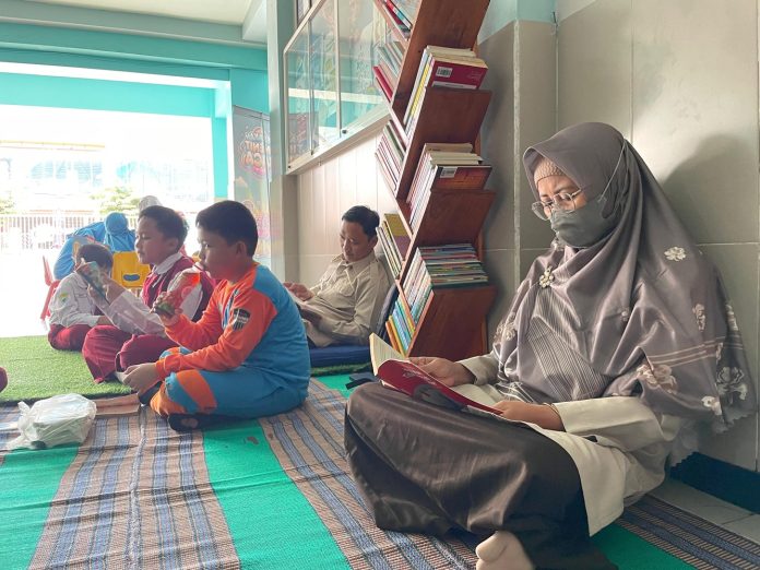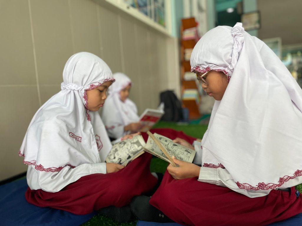 Beberapa siswa tampak membaca sambil menyantap jajanan kantin. Ada yang duduk bersila, ada pula yang merebahkan diri santai, semua tenggelam dalam dunia cerita.