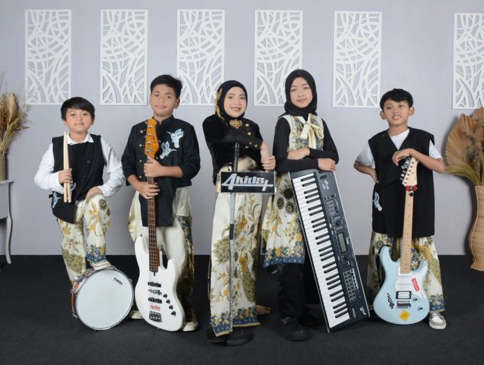 MUDIPAT.CO – 4Kids+ Band, band bocah SD Muhammadiyah 4 Pucang Surabaya (Mudipat) ini benar-benar keren dan luar biasa. Dalam setiap performanya band beranggotakan Aubrey Azka Calista (vocalist), Al Fatih Pangestu (gitaris), Arjuna Wijoyo Utomo (bassis), Ayuna Fatima Wijaya (kebordist), dan Muhammad Alizandy Zhafran (drummer) selalu sepenuh hati dan memukau pemirsa.
