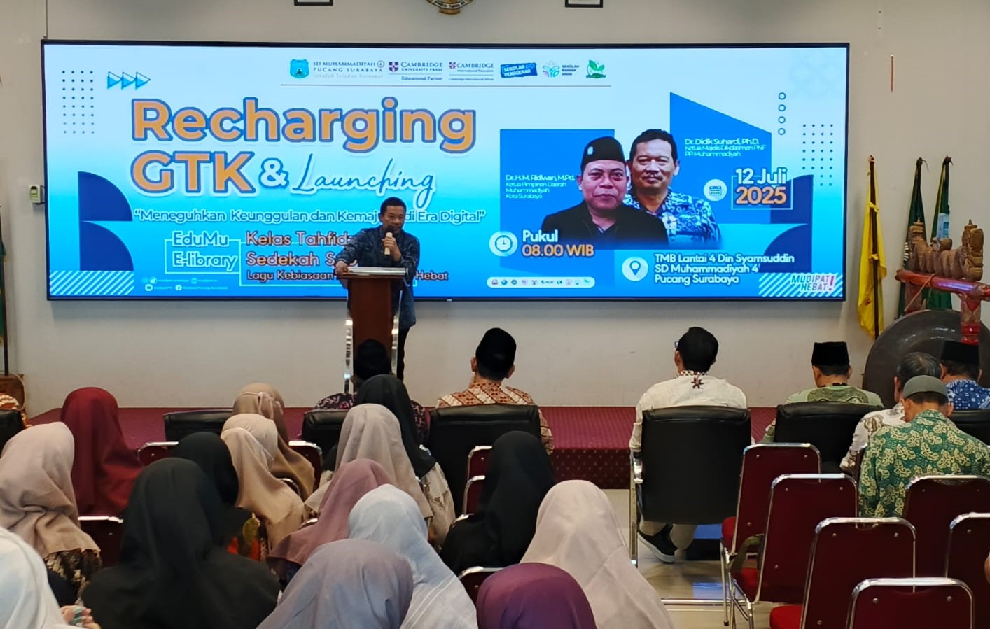 MUDIPAT.CO – Sekolah Teladan Nasional SD Muhammadiyah 4 Pucang Surabaya (SD Mudipat) melaksanakan kegiatan Recharging Guru dan Tenaga Kependidikan (GTK), Sabtu (12/7/2025). Kegiatan tersebut juga dirangkai dengan peluncuran lima program baru: EduMu, E-library, Kelas Tahfidz, Sedekah Subuh, dan Lagu Kebiasaan Anak Mudipat Hebat.