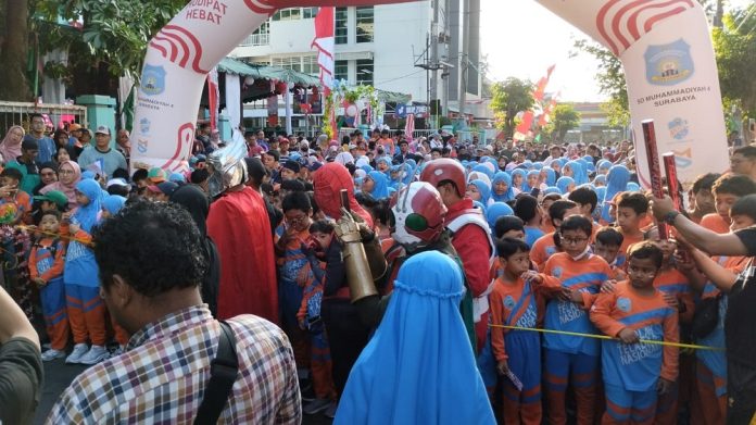 MUDIPAT.CO — 5.150 peserta yang terdiri dari guru, karyawan, siswa, hingga wali murid membanjiri SD Muhammadiyah 4 Pucang Surabaya (Mudipat) dalam rangka memeriahkan peringatan Hari Ulang Tahun (HUT) ke-80 Kemerdekaan Republik Indonesia. Acara puncak Kemerdekaan RI itu bertajuk “Generasi Kuat Indonesia Hebat” ini dimeriahkan dengan kegiatan jalan sehat pada Sabtu, 23 Agustus 2025, yang juga menyediakan ratusan hadiah menarik bagi para peserta.