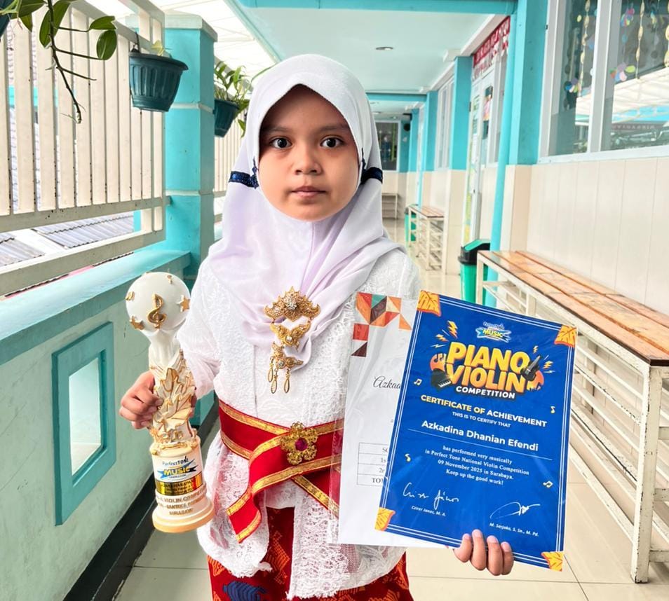 MUDIPAT.CO – Azkadina Dhanian Efendi, siswi kelas 3-B SD Muhammadiyah 4 Pucang Surabaya (Mudipat) mengukir prestasi keren di bidang seni musik. Azkadina meraih Juara Harapan 2 Perfect Tone National Violin Competition, berlangsung di Hotel Santika Gubeng, Surabaya, Ahad, 9 November 2025. Kompetisi diikuti puluhan peserta se-Surabaya. Azkadina membawakan lagu Allegro pada lomba tersebut.
