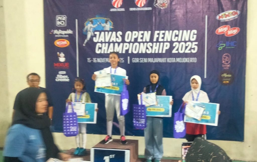 MUDIPAT.CO – Zavina Davie Roland, siswi SD Muhammadiyah 4 Pucang Surabaya (Mudipat) benar-benar keren. Siswi kelas 5-G itu meraih Juara 3 Floret Putri U-10 dalam Kejuaraan Anggar Javas Open Fencing Championship 2025 tingkat nasional, 15-16 November 2025.