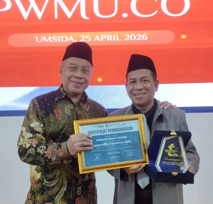 MUDIPAT.CO – Ketua Pimpinan Wilayah Muhammadiyah (PWM) Jawa Timur, Prof. Dr. dr. H. Sukadiono, MM, secara resmi menyerahkan piagam penghargaan kepada SD Muhammadiyah 4 (Mudipat) Pucang Surabaya. Penghargaan tersebut diterima langsung oleh Ustadz Edy Susanto, M.Pd, sebagai bentuk pengakuan atas peran sekolah tersebut sebagai pelopor Transformasi Digital di dunia pendidikan.